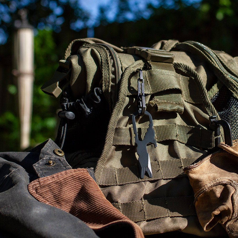 A simple, all-steel multi tool with bevelled pry head, bottle opener, wire stripper, half-moon cutter, and multiple wrench sizes. Weight: 0.6 oz. Color: Black.