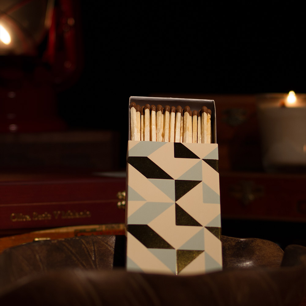 From HomArt California Design House, this box of 50 match sticks features a striking geometric box design with gold foil accents and coordinating match tips. Safety matches, 50 sticks per box, 4.5″ sticks with match head color coordinated to the box design.